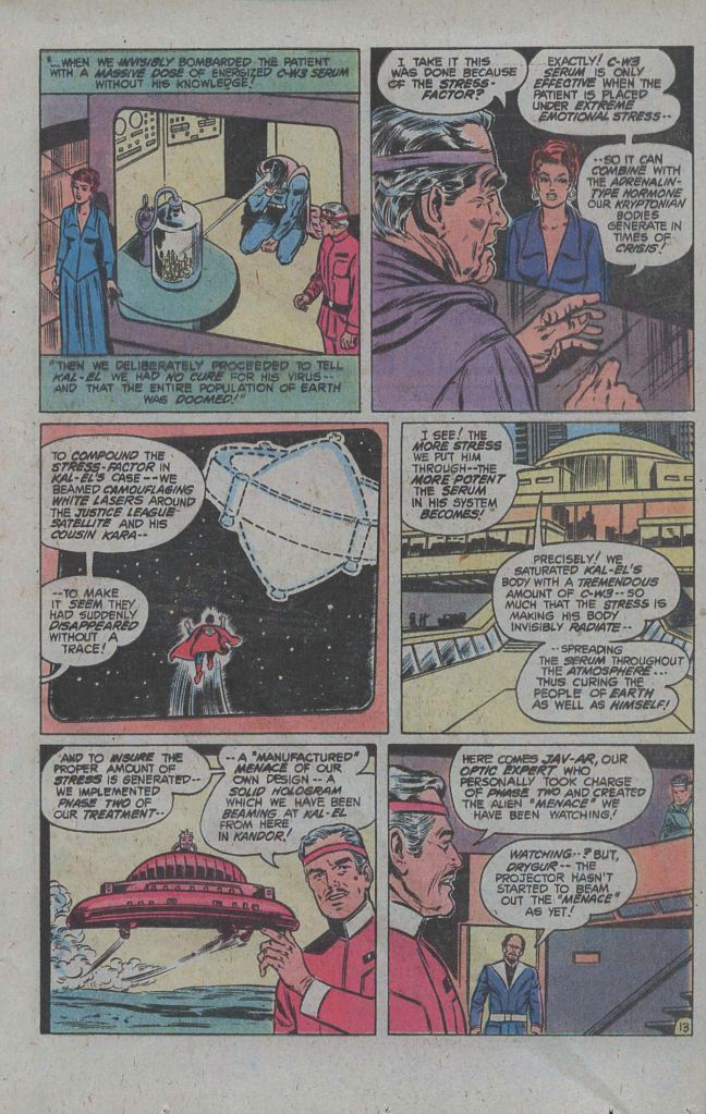 To punctuate his message, Z-V zaps Superman with weaponry from his starship, which batters and burns the Man of Steel. So Superman is under extraordinary pressure at this point, still needing to find a cure while also battling to stave off Z-V’s scavenging operation. And that, it turns out, is the whole point. For we cut back to the Bottle City of Kandor where we find the top scientists and physicians in congress. It is explained that they bombarded Superman with a concentrated dose of C-W3 serum, a cure for the virus. But in order to get it to spread across the globe in time, the Kandorians needed Superman to experience high levels of stress–it’s his own bodies adrenal response that will trigger the curative effect. Consequently, they told Superman that there was no sure, and used their science to cloak the JLA and Supergirl from him.