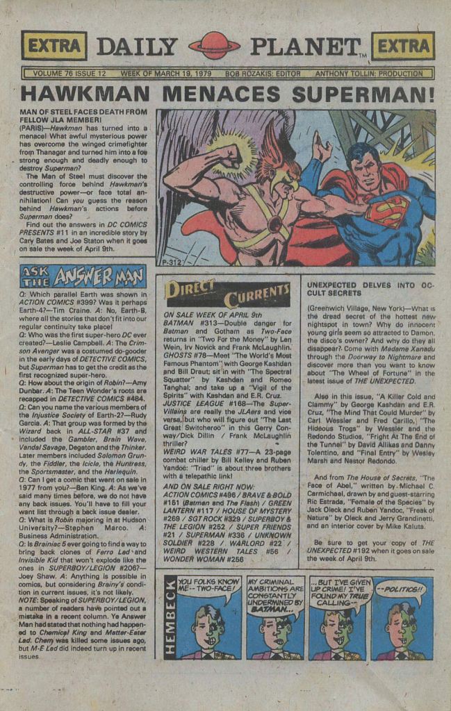 In addition to the regular Superman in Action letters page, this issue also includes that week’s edition of the promotional Daily Planet page, a thing I loved. I was always interested in hearing about what comic books would be turning up in a week–we didn’t have Previews catalogs or online solicitations in those days, so this was all the information I would get as to what might be coming next. As usual, the page includes Bob Rozakis’ Answer Man column in which he responds to questions from the audience, and another silly comic strip by cartoonist Fred Hembeck.