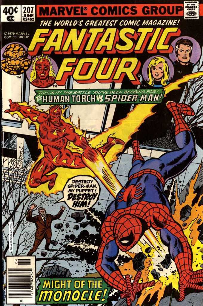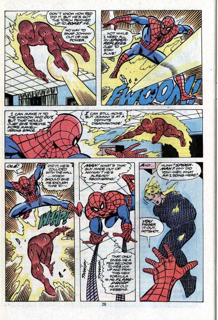 Discovering the two heroes, the Monocle activates the student body and sends them to kill Spidey and the Torch. This doesn’t work out so well, but it does send the campus into a chaotic battle sequence. In the midst of this, the Torch recognizes the Monocle and attempt to grab him. But unfortunately, the Monocle is able to reassert his hypnotic control over Johnny, and he sends the Torch at Spider-Man. But the wall-crawler is more than a match for a mesmerized Torch, and he’s soon able to web up his fiery cohort and take off after the escaping Monocle.