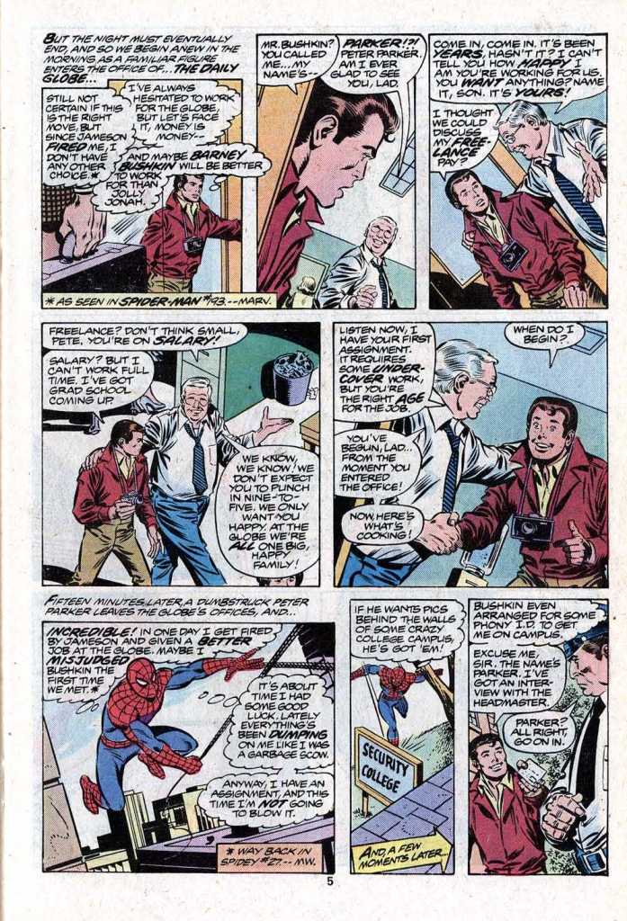 As you can see from this page, important story beats in the running AMAZING SPIDER-MAN series take place in this story, and for the whole of it, Spider-Man almost seems more like the lead character than the Human Torch. And none of the other members of the FF even appear–no mention is made of the cliffhanger that we left them in last month. As such, this feels like a story that was designed as an evergreen, but one that Marv subsequently dialogued after he’d placed it so as to knit it into the ongoing chronology a bit more precisely than perhaps it had been plotted. There’s nothing visual in this scene between Peter and Daily Globe editor Barney Bushkin that establishes this as the first time Peter has tried to sell photos to him in a very long time–but Marv dialogues it that way.
