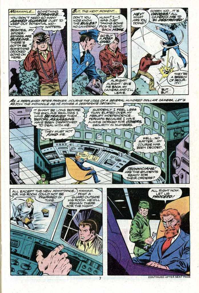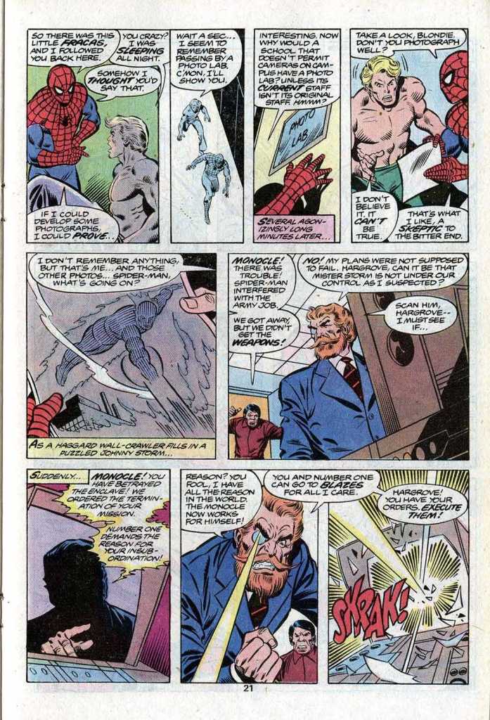 The Monocle, however, is intending to betray his Enclave benefactors, and so he doesn’t shut down the operation when ordered to do so. Meanwhile, Peter Parker’s been given the assignment from his new boss Barney Bushkin to poke around the strange, exclusive college and see what he can see. Peter is surprised to find Johnny Storm in residence, and the two link up and compare notes. Shortly thereafter, the Monocle sends his hypnotized army of kids, including the Torch, to raid a nearby army base. Spider-Man follows and prevents the crew from getting away with any ordinance. He also pursues them back to the campus, where he wakes up the Torch and tells Johnny just what has been going on while he’s been unconscious.