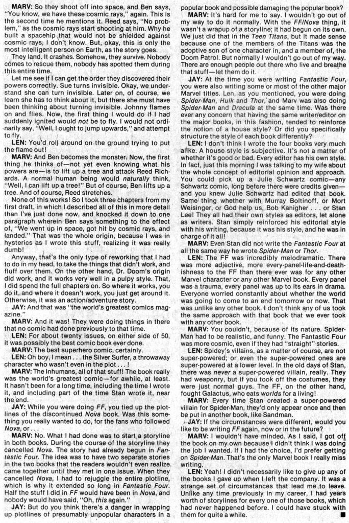 1. For that matter, when Marv says that the FF wasn’t the world’s greatest comic even when Stan was writing it, toward the end, he’s referring to the issues after Kirby left, I’d think — and wasn’t aware that those issues were being ghost-plotted by others.