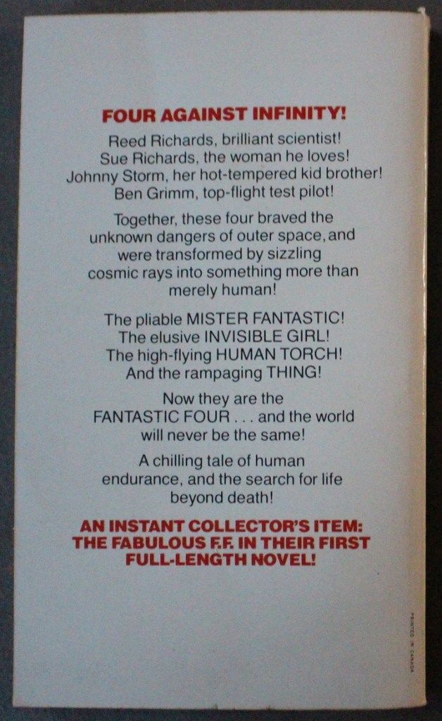 It may even have been on the drive back home from the movie theater that we stopped in to one of the local bookstores. And that’s when I found it: MARVEL NOVEL SERIES #5, spotlighting my absolute favorite series, the Fantastic Four. In addition to releasing paperback-sized reprint collections of early comic book stories, Pocket Books had also begun to roll out a series of Marvel-themed novels, in which the colorful characters from the comic book page were translated into prose form. My own copy of this edition is a bit worse for wear; at a certain point, I lent it to my similarly-FF-obsessed friend David Steckel, who wound up putting it into his pocket and cracking the spine in half as he proceeded to run and roughhouse.