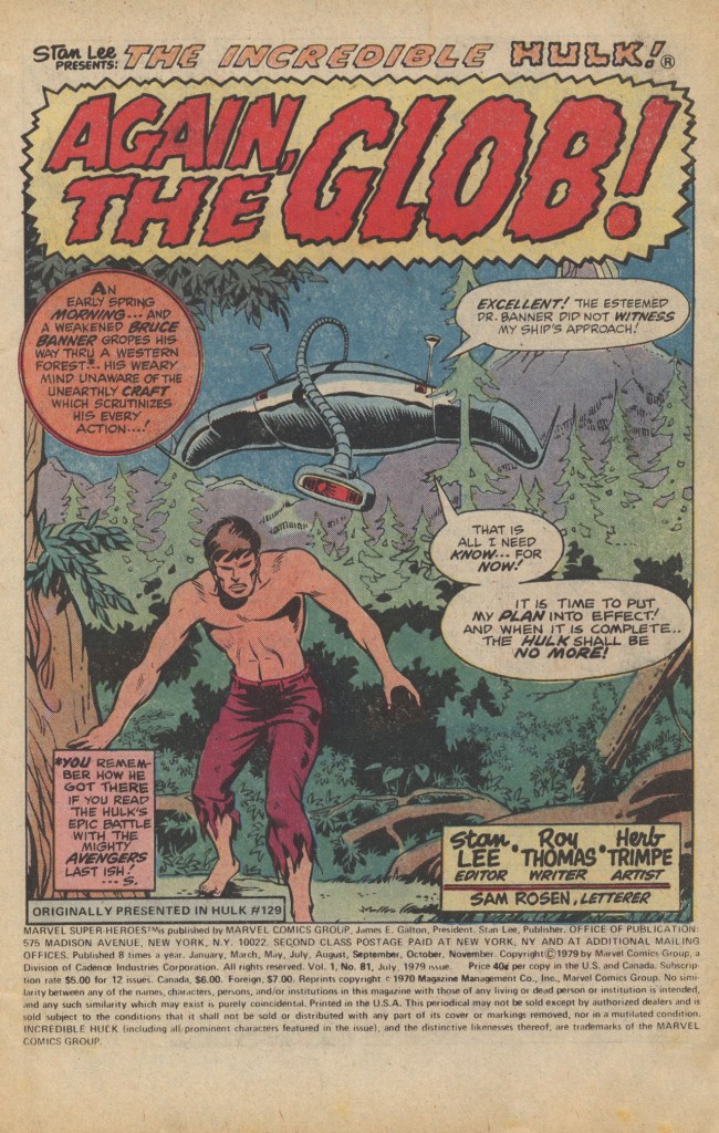 Seeking a way in which he might defeat his long-vexing enemy, and not worrying about running the unsuspecting Banner down with his truck, the Leader directed his super-mentality inward, concealing his true nature even from himself until he could learn of a way in which the Hulk might be destroyed. Having heard banner’s tale of the Glob, the Leader then pilots his craft to the area in which the confrontation took place and uses his super-science to cause the disparate bits of the Glob to reassemble themselves, restoring the creature. For a villain who claimed to be so smart, the Leader was typically awfully dumb, not really thinking through his plans. In this case, he implants an image in the Glob’s head of the Hulk threatening a girl the Glob’s human incarnation had feelings for, and lets nature take its course.