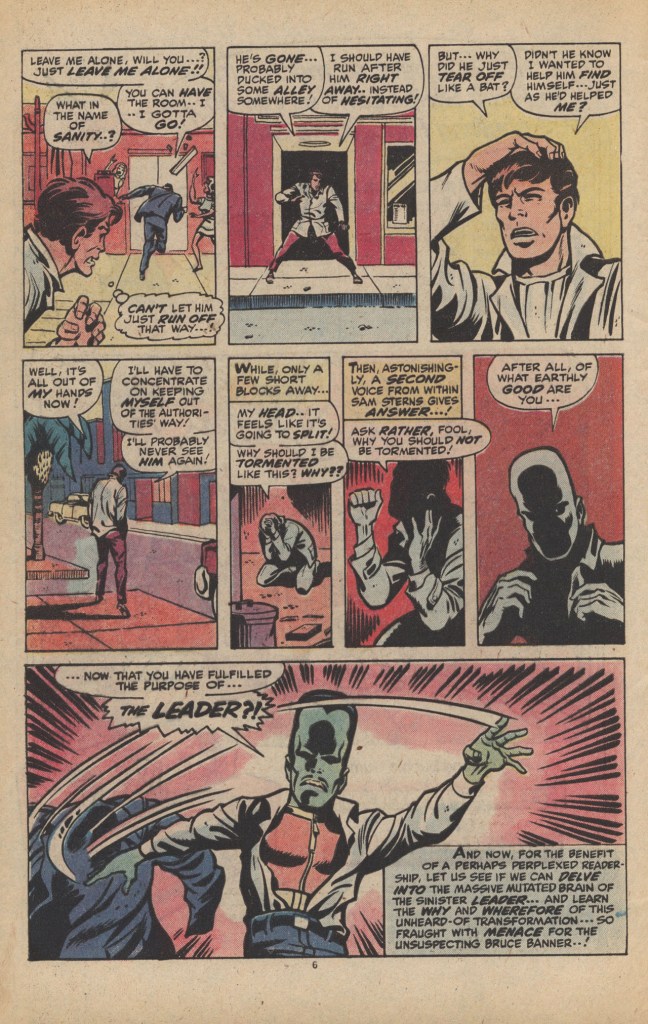 The story opens up with Bruce Banner staggering out of a forest, unaware that he’s being observed by a mechanical flying craft. Bruce promptly flags down a passing motorist to get a ride into town. But wouldn’t you know it, the driver has amnesia himself and has no memory of where he’s going or why. Either way, Banner could use a friend, and the two men spend a bunch of time together. Gossiping about his alter ego as one does, banner winds up telling the truck driver about the Hulk’s recent encounter with the Glob, who might almost have been a friend to the Hulk. At that point, the driver gets a sudden headache and races off–only for the camera to follow him as he transforms into the persona of the Hulk’s recurring enemy, the Leader.