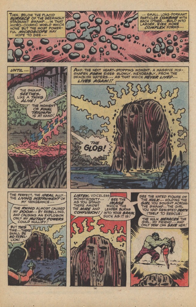 There was something in the air in the late 1960s and early 1970s that made the idea of a swampy muck-monster a thing that several different people were simultaneously thinking about. This sort of thing tends to point to some influence from the mainstream media, but I’m not sure just what that might have been this many years after the fact. But regardless, assorted comic book companies all unleashed a variety of such creatures in the span of only a few years: Man-Thing, Swamp Thing, a revival of the golden age Heap, and the villainous entity of this reprinted INCREDIBLE HULK story, the Glob. They were all extrapolations on Theodore Sturgeon’s creature from his story IT!, originally published in 1940.
