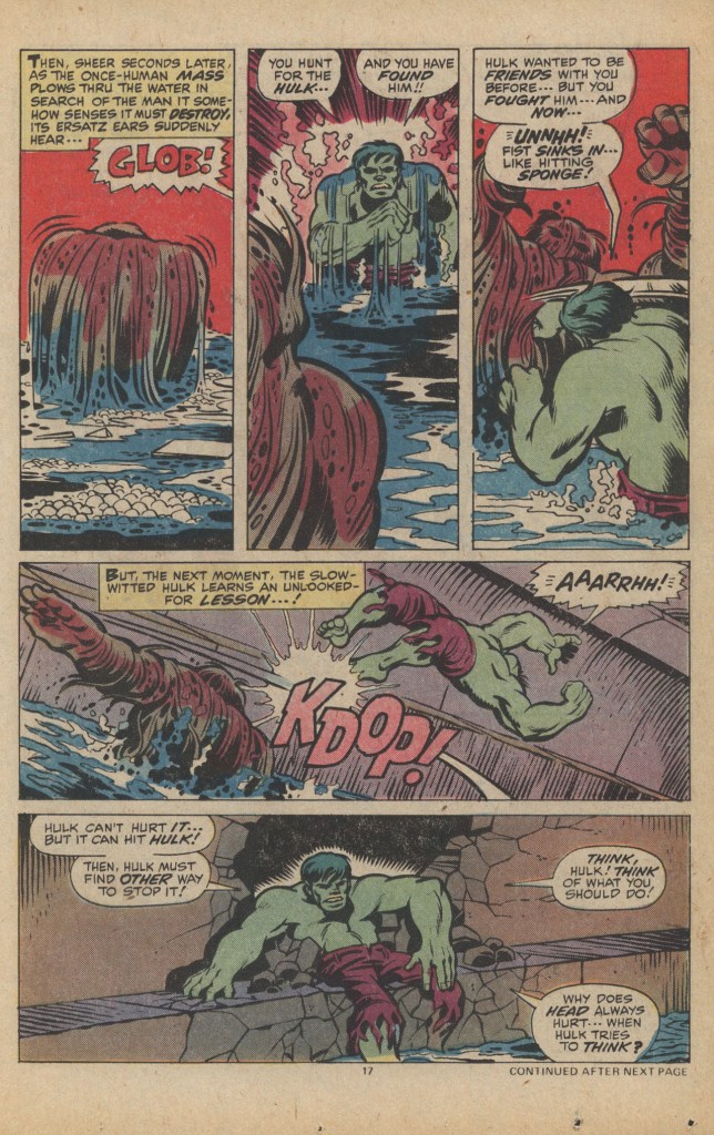 Writer Roy Thomas was certainly aware of Sturgeon’s tale when he created the Glob as a nemesis for the virtually-indestructible Hulk several issues before this one. Roy would later commission an adaptation of Sturgeon’s epic for the first issue of SUPERNATURAL THRILLERS as Marvel expanded. Regardless, the Hulk needed antagonists that could stand up to him, and the Glob fit the bill, in that he was physically powerful, hard to get a grip on, and could regenerate or reabsorb his scattered parts if destroyed. Otherwise, there wasn’t a whole lot more to the character. But there really didn’t need to be.