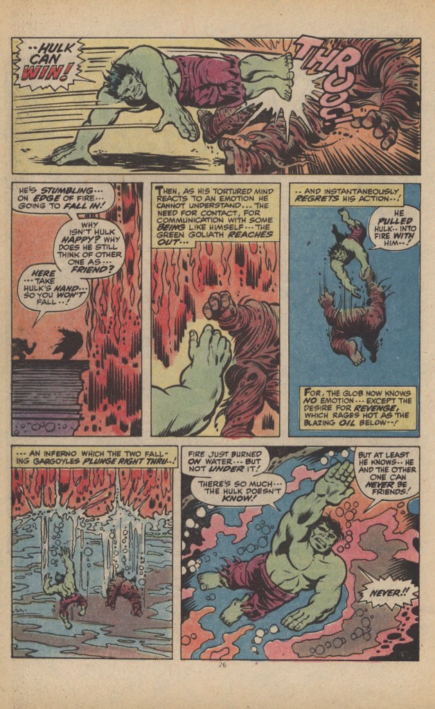During this era, INCREDIBLE HULK was pretty much a fight comic, with much of every story dedicated to extended fight sequences as the Green Goliath took on monsters and super-villains and robots and armies, and this issue is no different. The remainder of the book is an extended fight sequence in which the Glob seeks out Banner to destroy him, and Banner transforms into his brutish alter ego so that the battle can be joined. This gave artist Herb Trimpe an opportunity to shine. Trimpe wasn’t quite on the level of a Jack Kirby when it came to choreographing action sequences, but he was called upon to do so with such regularity that his skill level grew accordingly.