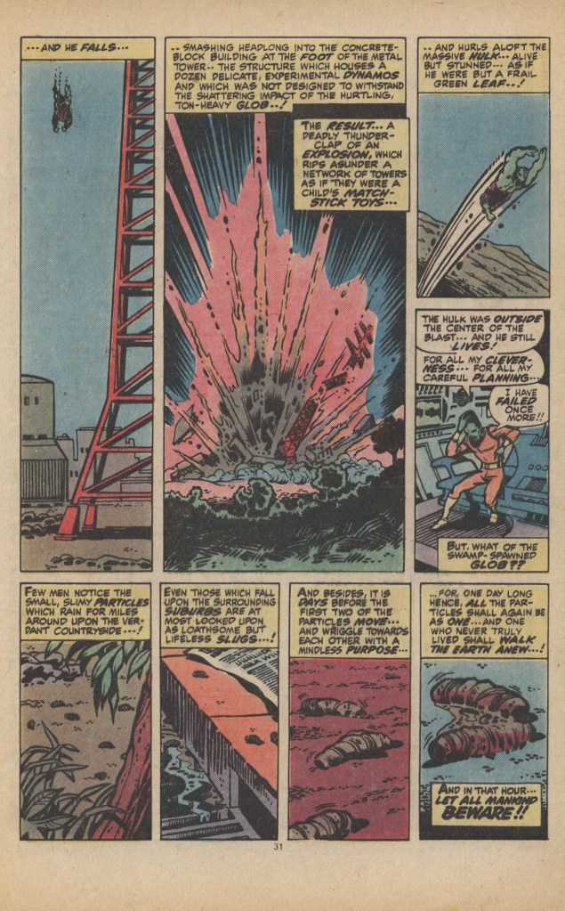 Eventually, though, the issue is out of pages. And so in an overstuffed sequence, the Hulk climbs a high tension power line tower, pursued by the Glob. the Hulk remembers electricity, though, and he tears away a power line, zapping the Glob with it. The muck-monster is jolted by the shock and falls into a nearby building containing several “experimental dynamos”. The place explodes, ending the Glob’s menace for the moment–though at the end, we see his scattered particles begin to draw closer to one another. For his part, the hulk simply leaps away once again, while the dopey Leader fumes that his intricate planning resulted in another zero. So it went for the Hulk in the 1970s.