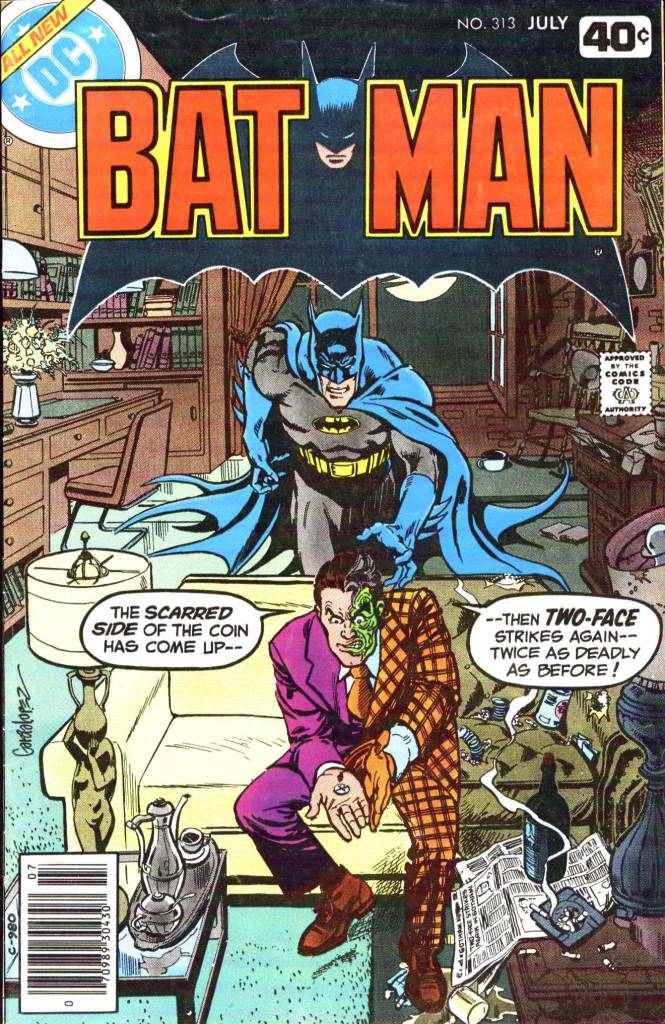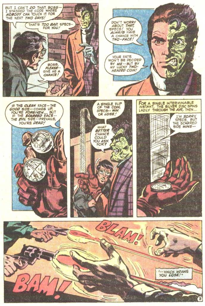 That cover has stuck in my mind as one of my favorite Two-Face images. I can believe that he’d make sure to sit on the couch just so, on the exact dividing line between “good” and “bad” room halves. The bottom part of the couch isn’t split properly though, that’s an art flaw (did whoever altered the couch justify being lazy as a half-done job?). And does Two-Face actually smoke at all, or does he have the cigarette burning as a prop for decoration?