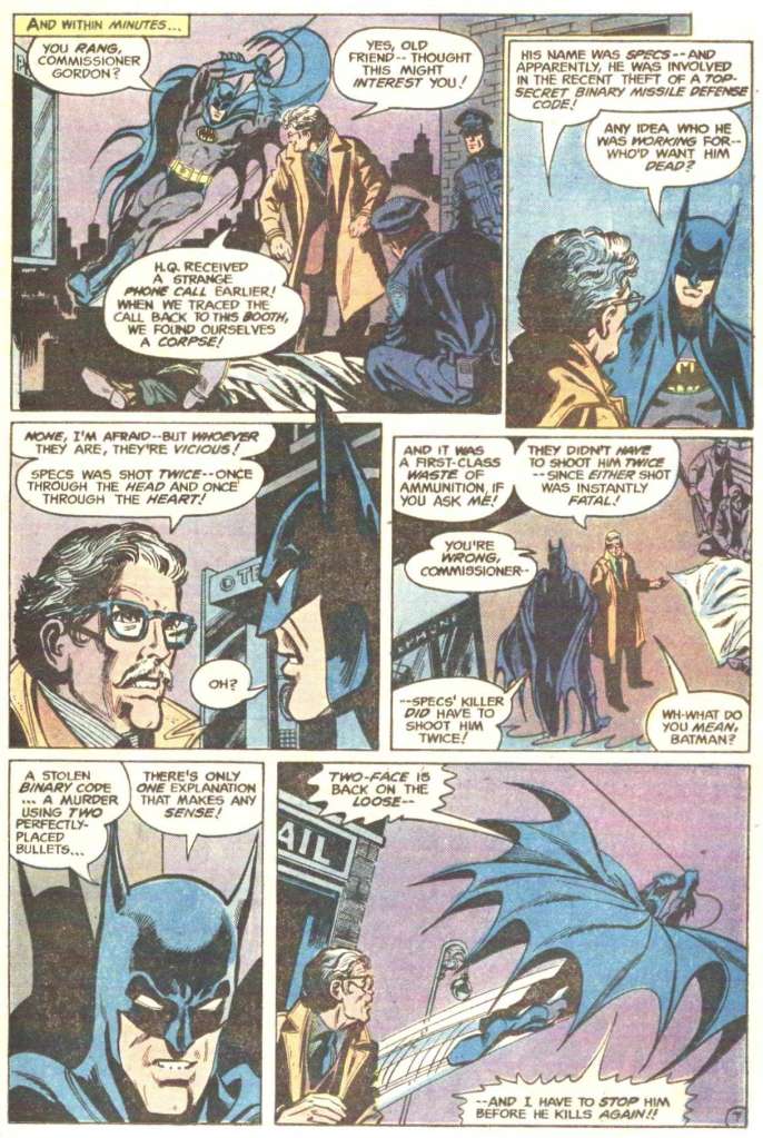 The issue opens with a small-time Hood named Specs (for obvious reasons) calling in a tip on the whereabouts of a stolen Binary code that provides access to America’s missile defense system. But before he can complete his call, he’s interrupted by Two-Face and the rest of the gang. Specs was on board with this heist when the objective was to sell the code back to the Government, but now that Two-Face is considering selling it to an enemy nation instead, Specs wants no part of it. Specs has stashed the code in a place he can’t immediately access, and he loses a coin toss, so Two-Face guns him down, putting two bullets into him. Meanwhile, Bruce Wayne is getting to know his date Selina Kyle, once the Catwoman, better. But the Bat-Signal appears in the sky and consequently their date is cut short so that Bruce can find out what the Commissioner needs Batman for.