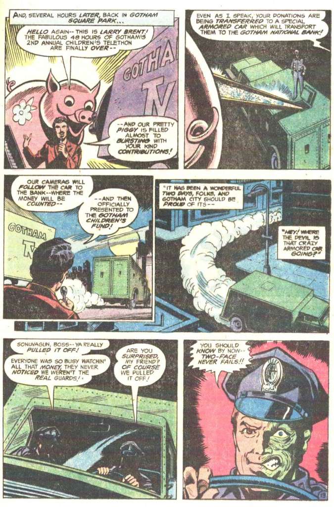 All throughout the issue, there have been asides and cut-aways to a multi-day charity drive that’s been going on with a Bill Finger-sized giant piggy bank full of money. It’s clear that this is where Specs hid the purloined code, since it wouldn’t be opened for two days. Accordingly, Two-Face and his remaining gang pose as armored car guards and make off with the proceeds from the charity, assuming that the missing Code must be in among it. But Batman and faraday have deduced the location of the Code as well, and the pair pursues in the Batmobile. Batman uses the vehicles lasers to destroy Two-Face’s tires, causing the escaping armored car to crash.