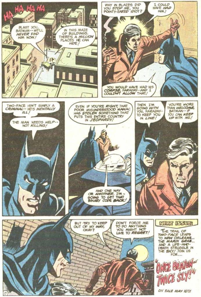 After the commissioner gives Batman the lowdown on what’s been happening in the rest of the issue, the Caped Crusader goes in search of his quarry Two-Face. he finds the malefactor and his gang holed up in–of course–222 Second Street, Apartment 2-B. This leads to a pretty one-sided fight where Batman clobbers his way through Two-Face’s goons in pursuit of the main villain. At a certain point, the battle is interrupted by a gun-wielding lawman who utters that everybody is under arrest. This gives Two-Face the opportunity to drop a steel barrier that bisects the room, and he’s able to escape while Batman and the lawman attempt to get through it. In the aftermath, the lawman introduces himself as King Faraday, a government agent and a character from DC’s past who had headlined in DANGER TRAIL back in the 1950s. Faraday is ready to do anything to recover the stolen binary code, but Batman owes a debt to Harvey Dent, and that means he wants to bring in Two-Face alive and unharmed.