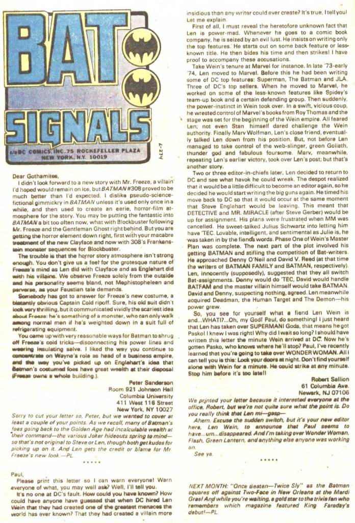 The Bat-Signals letters page in this issue includes a letter from future comic book historian Peter Sanderson, who was a frequent contributor to such pages across both companies, Marvel and DC. There’s also a fun and witty tongue-in-cheek letter about how Len Wein inevitably takes over all of the top features at whatever company he’s at, which editor Paul Levitz responds to in kind.