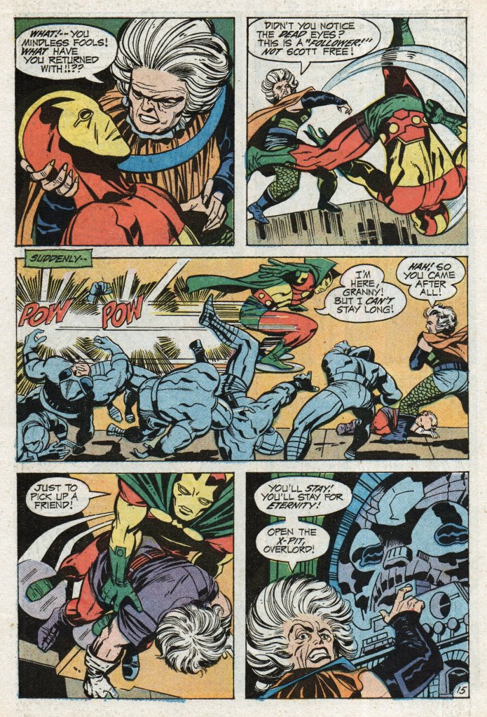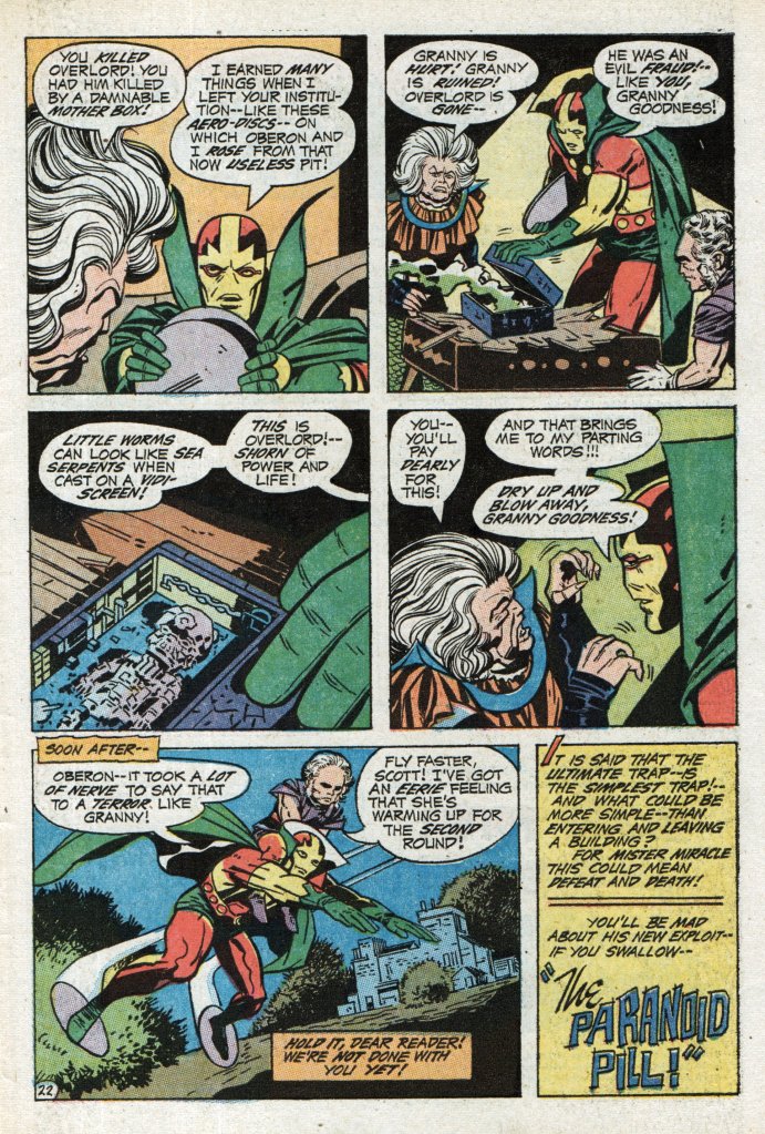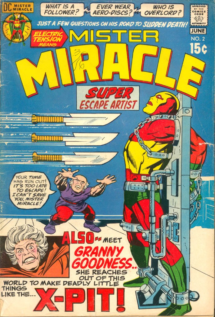 But moments later, Granny’s footsoldiers enter the grounds and capture both Oberon and the Follower, thinking that he’s the true Mister Miracle. Scott suits up and pursues them back to Granny’s citadel, intent on rescuing Oberon. But before the pair can make their escape, Granny has Overlord trap them in the X-Pit, a complex series of cunning death traps designed to test Scott Free to the limit, and ultimately to destroy him for the crime of having escaped from Granny and run to Earth.