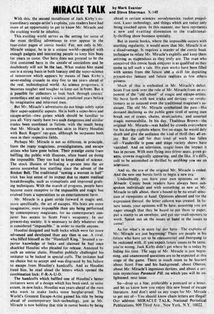Like FOREVER PEOPLE #1, this issue of MISTER MIRACLE included a text page revealing background behind the making of the series, this one written by Kirby’s assistants of the time, Mark Evanier and Steve Sherman. This one was less colorful than the one Marv Wolfman had done in FOREVER PEOPLE #1, and so it didn’t stick we me in quite the same fashion.