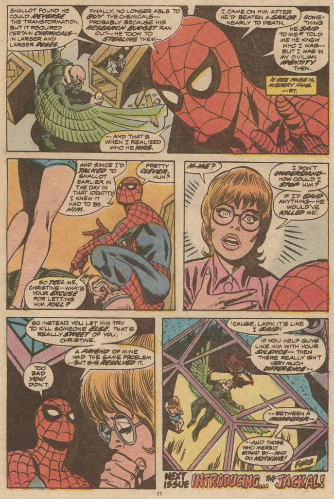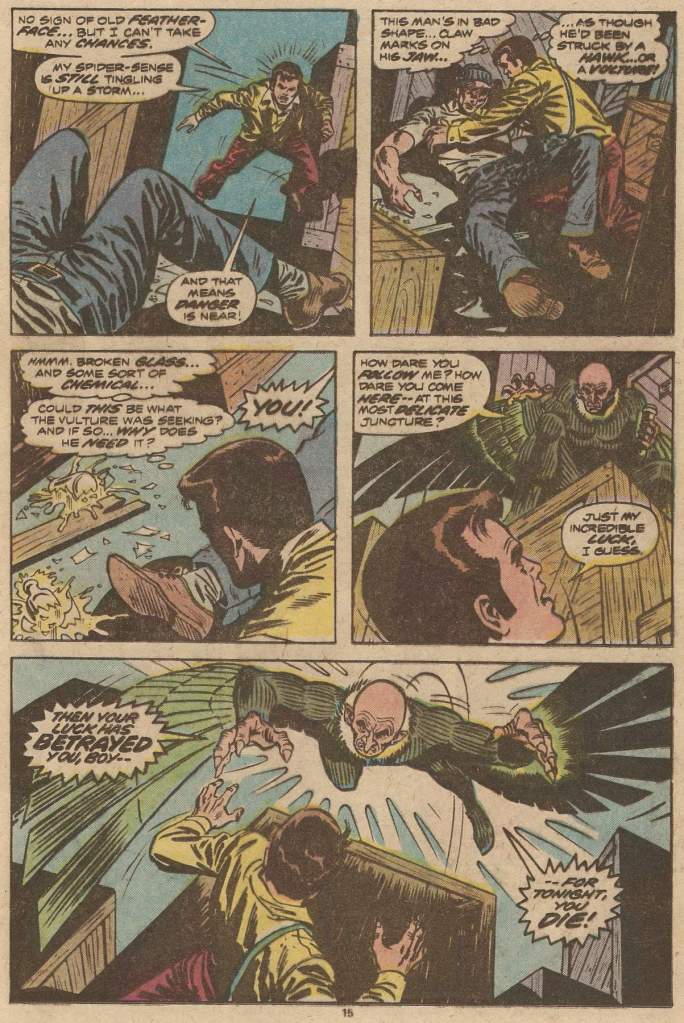 There’s a final wrap-up page or two where Spidey explains the murder mystery to the readers. It was Shallott’s assistant Christine who had been the real target of the murder, but her similar-looking roommate got killed by the Vulture rather than her, and MJ saw the whole thing, making her the next target. The wall-crawler dresses Christine down for not doing anything and letting one innocent person die and a second be terrorized. It’s a perfectly fine story, very grounded, very real world despite the fact that it also includes scientists transforming themselves into winged monsters. Most Spider-Man stories of this period felt just a hair more real-world and plausible than most super hero fare, even when they were being silly or weird. This too was a big part of Spidey’s appeal in the 1970s.