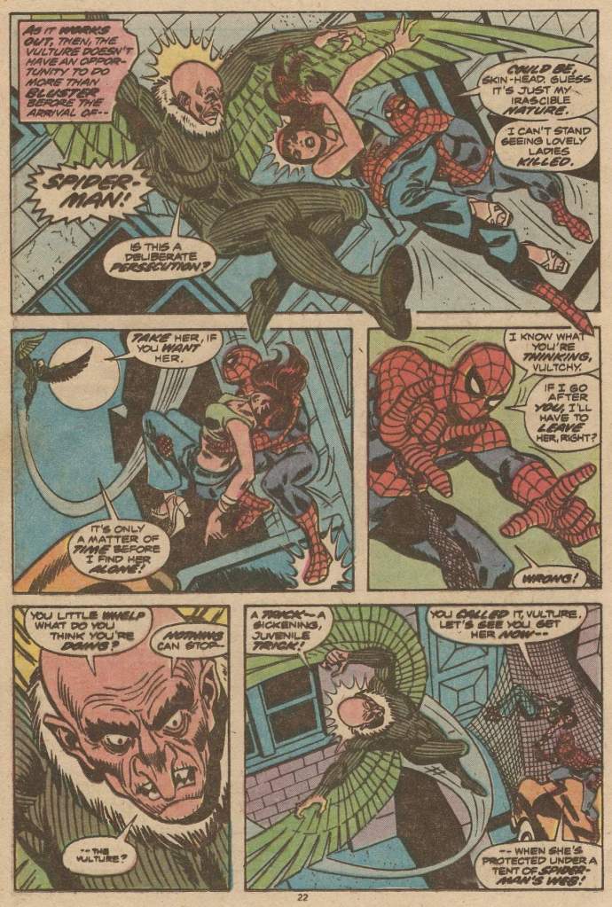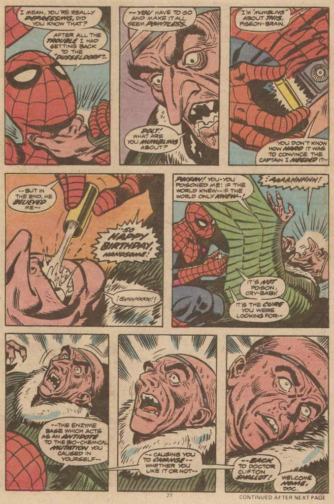 But the web-slinger has already worked out what’s going on, and the fact that the foe that he’s been facing isn’t the genuine Vulture at all, but rather one Doctor Clifton Shallot, who used a bio-enzyme to mutate himself into a human vulture. Spidey heads for a showdown at Shallot’s lab, where he’s able to confront the scientist. Spidey’s brought along the antidote to Shallott’s transformation as well, which he force-feeds to the pinned down criminal, returning him to his normal human state. This whole thing was Conway’s attempt to field a Vulture who was more monstrous and formidable than Adrian Toomes, who presented often as an old man. Didn’t quite take, though, and so Shallott was never seen again.