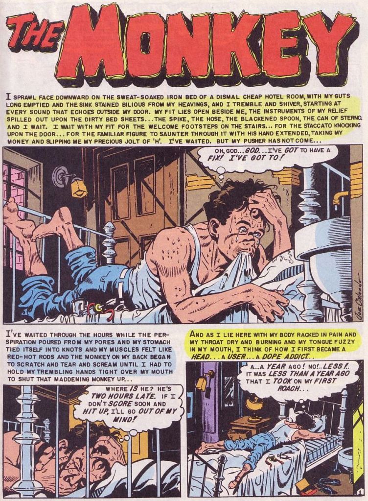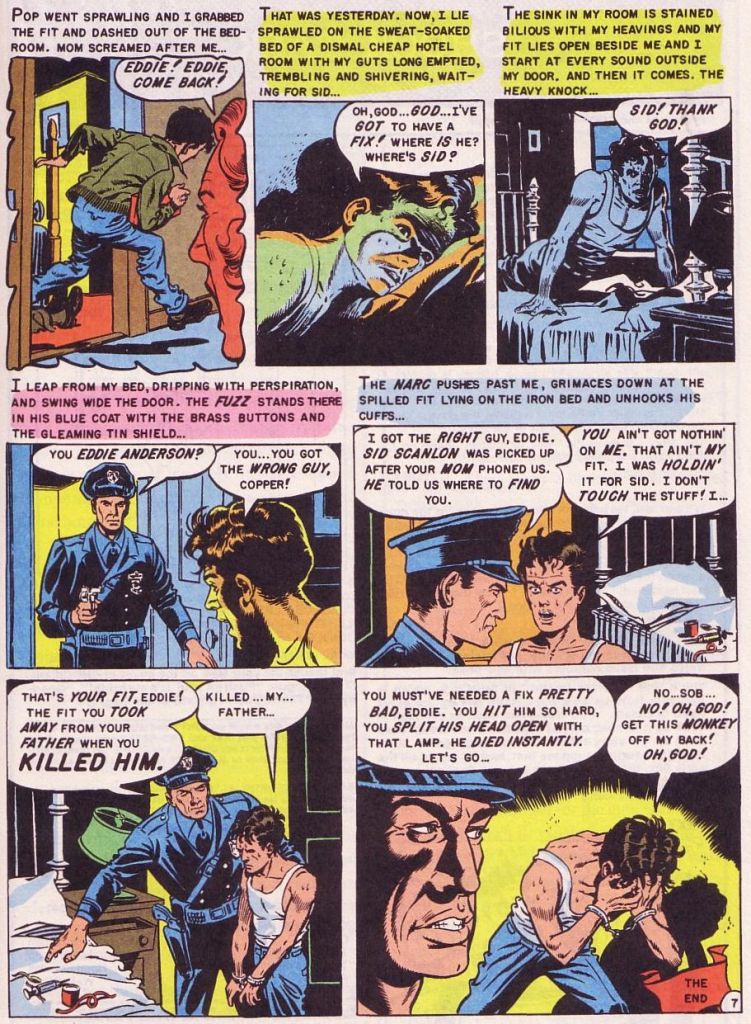 If anything, they were maybe even a bit too literate, in that writer and editor Al Feldstein packed each page with mountains of text. He was effectively writing a short story, one a day at the height of EC’s production time, and his prose style was appropriately pulpy. EC books weren’t meant to be read quickly, and if you weren’t willing to pore over the exhaustive captions, they weren’t going to make a heck of a lot of sense. EC was also willing to tackle subject matter that nobody else in the field would touch with a ten-foot pole. In particular, the second story in each issue of SHOCK SUSPENSTORIES, the magazine dedicated to twist-ending tales, was known as a “preachie”, in which Feldstein and editor Bill Gaines would sound off on some hot-button topic, including race, religion, and in this particular issue, drug abuse.