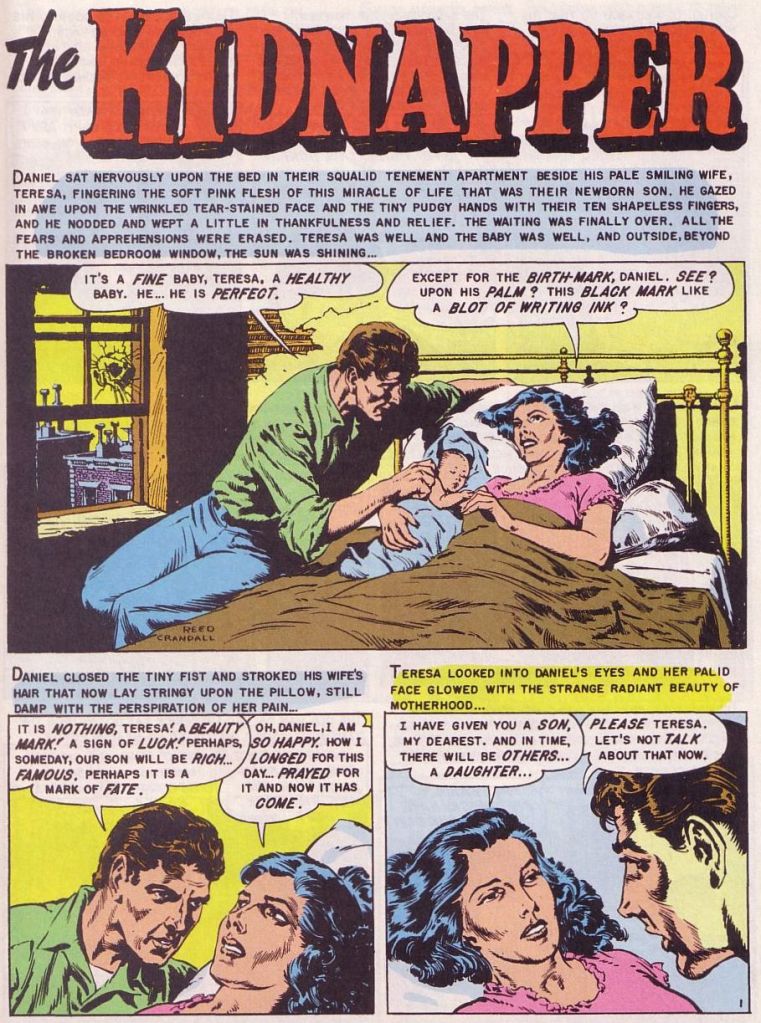 The second story, the preachie, was illustrated by Joe Orlando and it’s all about a kid who gets so hooked on Heroin that he winds up killing his own father for a fix. As a kid, I didn’t really have any working knowledge of drug culture, so this story scared the crap out of me and made me determined not to go down a similar route. So it did its job, even decades after the fact. The third story in the issue was illustrated by Reed Crandall, and concerned a couple whose baby is kidnapped. This sends the wife into a downward spiral of depression and madness. Finally, pushed to his breaking point, the husband decides to steal another baby to replace the boy they’d lost. But he’s caught and beaten to death by an angry mob. And of course, the child that he tried to snatch turns out to have been his own baby in the end. These stories had a familiar rhythm to them, though reading them as a kid, their impact was all new to me.