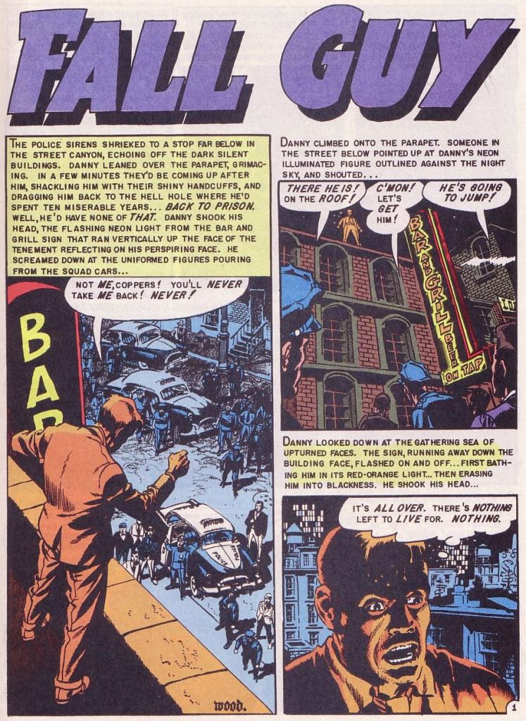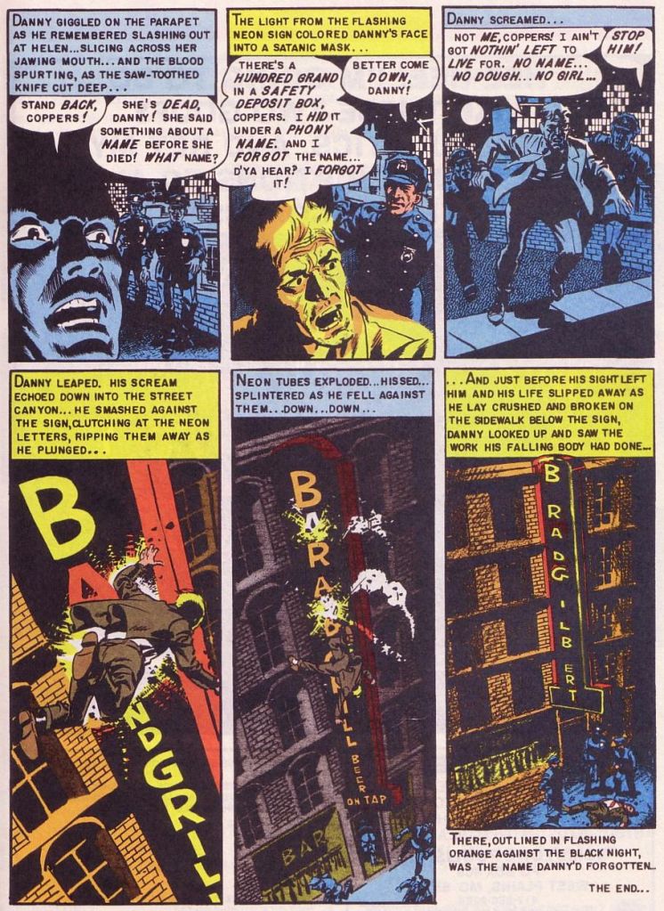 The final story is illustrated by the great Wally Wood, and is the one that perhaps had the longest influence. Alan Moore and Dave Gibbons referenced it visually in WATCHMEN when Rorschach is cornered by the authorities. It’s about a guy who steals a hundred thousand dollars in order to get with a gold-digging woman, but who is foiled when he can’t remember the false name he gave when he deposited the stolen cash into a brand new bank account after a fifteen year stint in prison. Cornered on a rooftop by the police, the man leaps to his death, colliding repeatedly with the neon sign for the Bar & Grill in the lobby of the hotel he was standing on. And as he perishes, the remaining neon lights spell out the name that he had forgotten, the rest of them shattered by his impacts. It’s a pretty memorable ending. While not every story hit with me, enough of them did that I found the experience of reading these EC books to be exciting and a bit lurid. This was definitely worlds apart from teh super hero books that were my mainstay meat.
