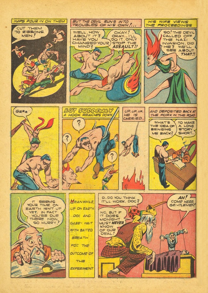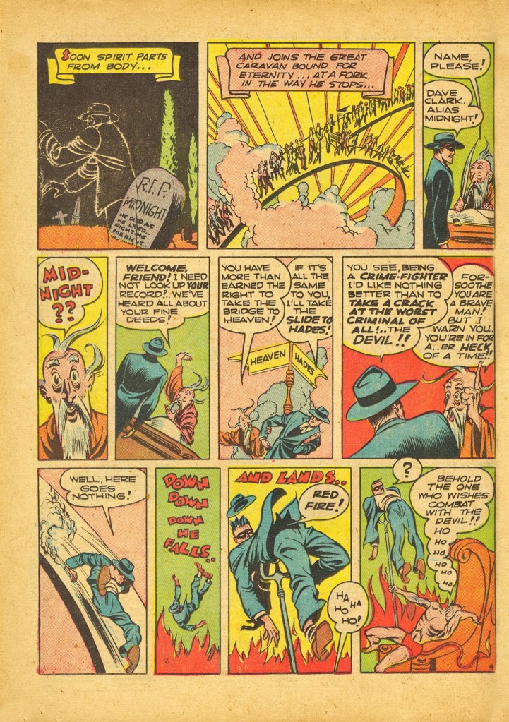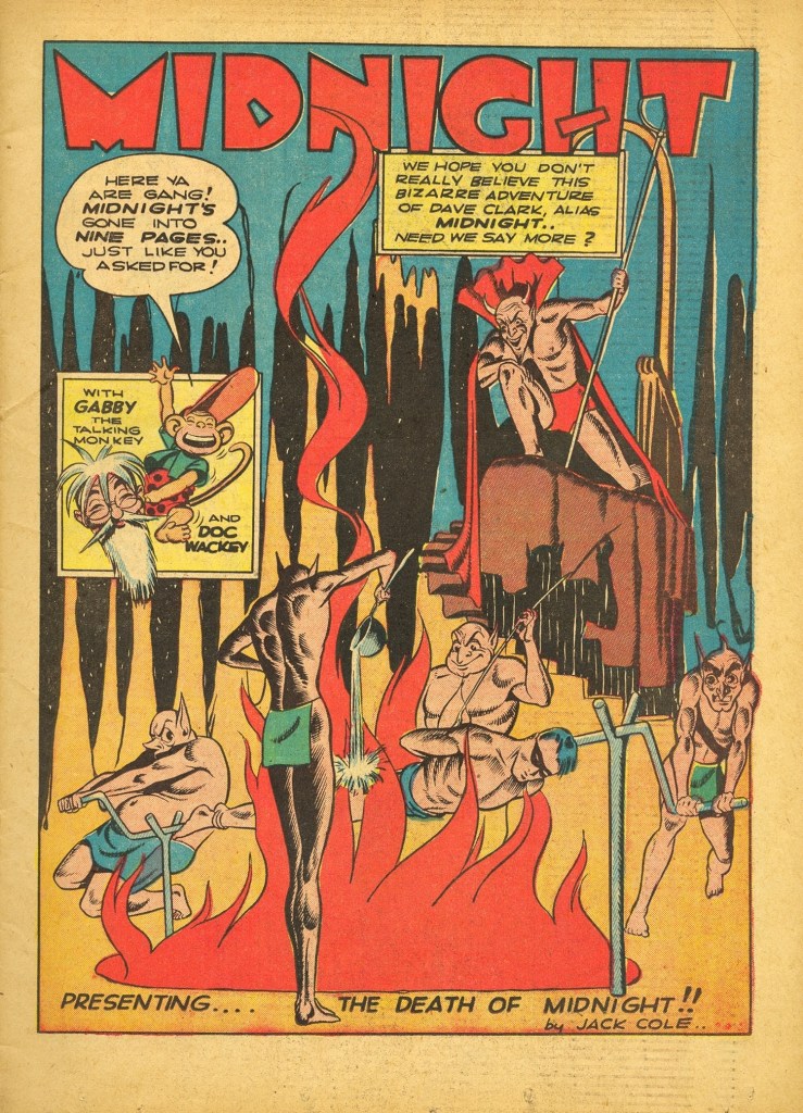 Cole, however, wasn’t content to simply follow Eisner’s lead, and so Midnight quickly steered in its own direction. For one thing, Cole gave the crime-fighter a pair of confederates: inventor Doc Whacky and the talking monkey, Gabby. And Cole’s stories weren’t quite so hard-boiled and down-to-earth. Rather, they were often elaborate flights of fancy–such as this one, in which Midnight is killed and battles the devil.