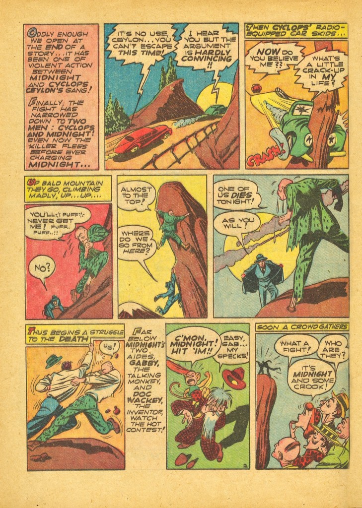 The creator in question was Jack Cole, a prolific cartoonist who had been working in the field practically since the advent of comic books. He had a charming cartoonish style and sensibility, and his pages had a lot of life to them. At the time when this story was done, Cole was also working on what would become his signature character, Plastic Man, for Arnold/Quality’s POLICE COMICS. But he also did Midnight, which itself grew in popularity. After debuting in the back pages, it was promoted to the lead feature and expanded to nine pages from six.