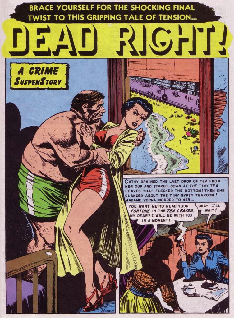 The first story in the issue was illustrated by Jack Kamen, and written (as all of the stories in this issue were) by editor Al Feldstein with contributions from publisher Bill Gaines. It’s a crime story, and it concerns a golddigging woman whose fortune teller predicts that she’ll marry a man who will come into a small fortune of $25,000 and then die violently shortly thereafter. The woman finds the man in question, and even though she finds him repulsive, she marries him in order to inherit the wealth that he’s going to inherit. But events take a turn when the woman herself wins a contest as the one millionth customer at a local cafeteria and takes home $25,000. Disgusted by her husband and with cash in hand, she berates him and tries to leave him–and he murders her, thus inheriting the $25,000. And thereafter, he’s given the death penalty, thus fulfilling the prophesy. It’s a bit by-the-numbers, but Feldstein and especially Kamen are excellent at making the husband truly repulsive and the woman morally bankrupt and loathsome so that you cheer when she gets her comeuppance.