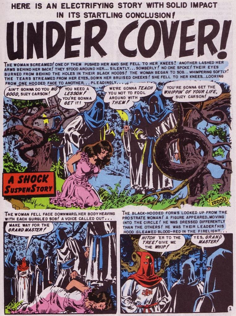 1. Although I grew up with the “relevant” comics of the ’70s, “Under Cover” left a strong impression on me because even though Marvel and DC had their share of faux Klan groups I wasn’t used to seeing the racists win so definitively in a story. “Not So Tough” also struck me because of its dark humor – one of the many reasons those EC reprints were catnip for teen-aged me – but I have no memory of the other two stories.
