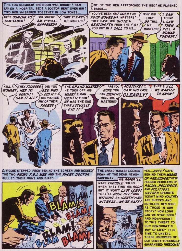 The second story was beautifully illustrated by Wally Wood, who also contributed this issue’s cover, and it’s one of the best remembered of the “preachies.” It’s about the Black Vigilante Society, a thinly disguised version of the Ku Klux Klan, who is meting out punishments to those in their community who are consorting with the “trash elements”–black people, though the text never states that explicitly. A reporter who is investigating the Vigilantes sees them accidentally kill a woman they were flogging and gets a glimpse of the unmasked face of the group’s Grand Master. Intending to expose them to the FBI, the reporter is discovered instead by the Klan members, who beat him into unconsciousness. When he comes to, he’s in a hospital bed, and the FBI agents he called before getting struck down are there. He tells them that he knows who the Grand Master is–and then the men pull their guns and execute the reporter. The text makes it very clear that these guys are all fake FBI men, though the subtext of what’s being shown is the idea that such bigots can be hiding anywhere, even within the ranks of law enforcement. So this one is hard-hitting and remains relevant even today.