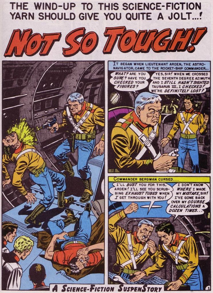 The third story in this issue was a science fiction tale illustrated by Joe Orlando, though it’s climax turns a bit more on horror than actual science fiction. It’s about the hard-ass commander of a rocket ship that drifts off course and gets lost. The commander busts the ship’s navigator down to a regular crewman, and installs a replacement navigator who isn’t up to the job. As the situation grows worse and essential supplies such as food and oxygen begin to dwindle, the commander remains hard and inflexible, enforcing his tough military discipline despite the fact that the crew is all suffering.