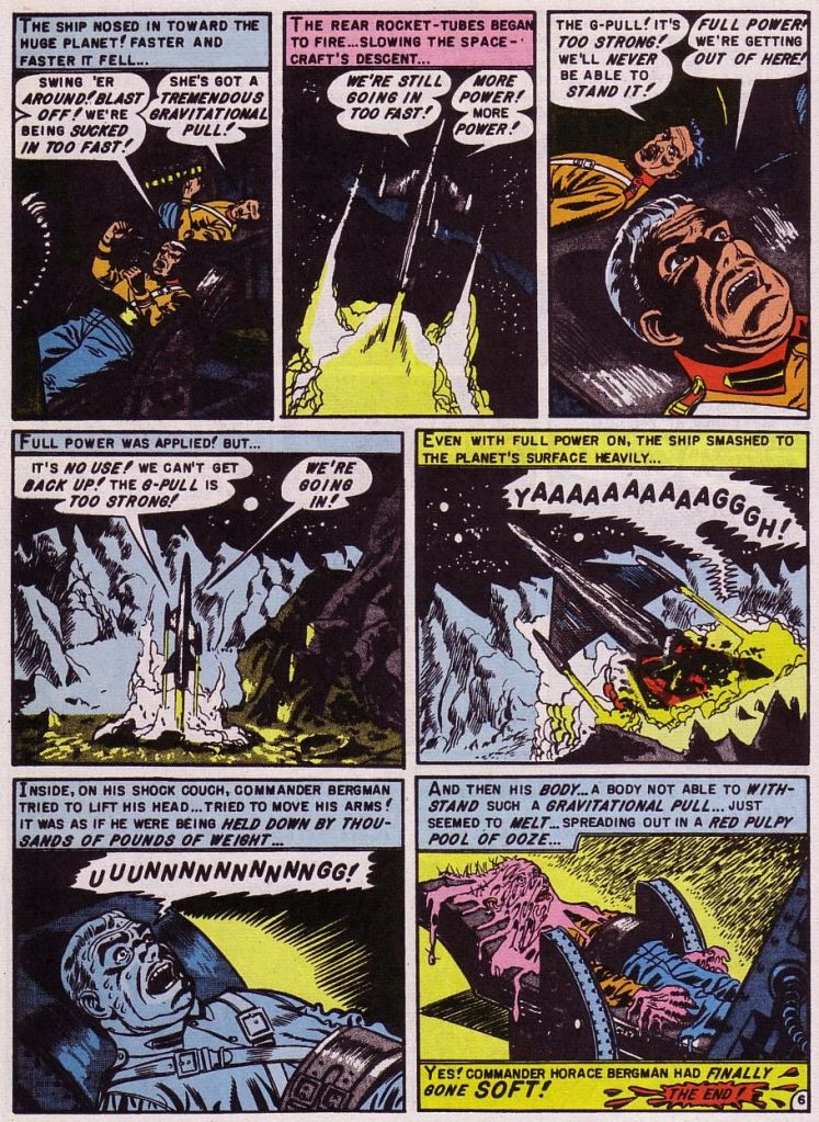 When the commander lets the replacement navigator die rather that give him vital oxygen, the navigator snaps and begins what looks like it will grow into a full mutiny. But the commander coldly guns the navigator down and ejects both of the bodies into space. But thereafter, when the ship comes across a planet that has the oxygen and supplies the crew needs in order to survive, it doesn’t have a competent navigator to realize that the gravity on this planet is more than their ship can handle. And in the closing page of the story, the ship crash-lands on the planet, and the intense gravity liquifies the intractable commander, reducing his body to a gory ooze. The whole story is built around the final punch line gag: the commander has finally gone soft. It’s a groaner, but the story does convey a decent sense of suspense.