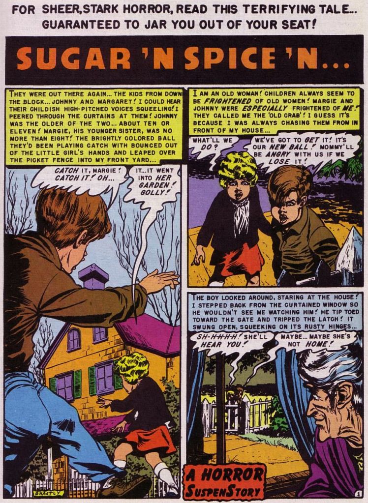 The final story in the issue was the horror outing, illustrated by “Ghastly” Graham Ingles. And as EC did on a couple of occasions, the punch line here is that the story is a modern day retelling of a classic fairy tale couched in horror terms. This one is Hansel and Gretel, in this case John and Margaret, who are tormented by and who in turn torment a strange old woman who lives in a house on their street. On Halloween, though, they’re lured into the house, which it turns out is made of candy. And the old woman is actually a witch, who winds up cooking them. It’s a very basic outing, and not as extreme as it might have been in an actual EC horror comic–there isn’t any real gore or anything shown, the horror is entirely psychological. The preceding science fiction story is more graphic in what it depicts. But it’s got the essential EC combination of horror and humor.