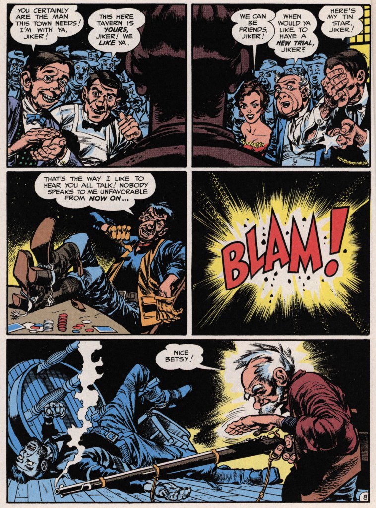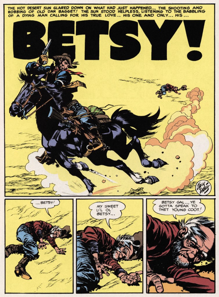 The story’s about Jiker Miller, an outlaw who had years before been sentenced to five years in prison by the people of a little town. But now the violent Jiker has returned to get his revenge, and he steamrollers into the place, first shooting and robbing old Dan Bagget and then terrorizing the denizens of the local saloon, including the judge that sentenced him and members of the jury. Eventually, the town sheriff shows up, and Miller proceeds to beat him to a bloody pulp. All the while, we’re cutting back to Dan Bagget, who is slowly making his way back to his homestead, talking about his girl Betsy and how she needs to straighten Jiker out. On the final page, with the townspeople cowed, it looks as though Miller has won. And then he’s suddenly killed by a shot from out of frame–and the final panel shows Bagget with his rifle, which he’s named Betsy. Davis’ art is excellent in this story, and the rhythm of it works well even if the end beat is a bit obvious.