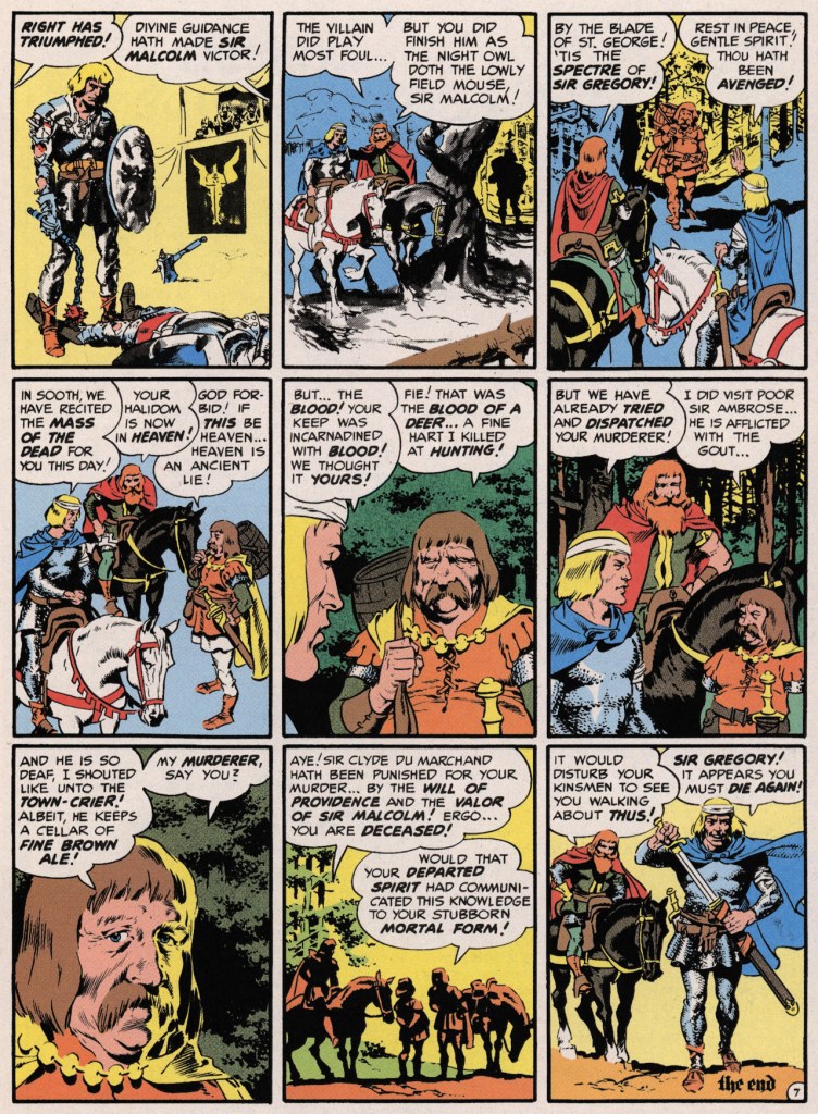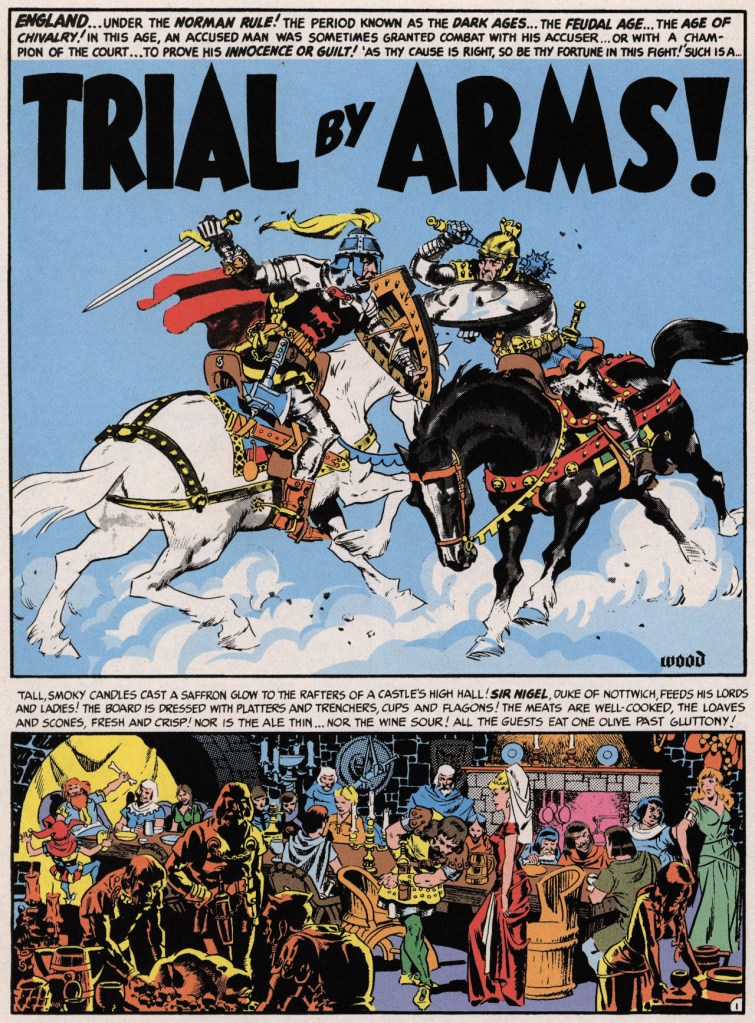 The following story was written and illustrated in lush fashion by the great Wally Wood. Jerry De Fuccio provided most of the script and copy, but the story was Wood’s all the way, a reflection of his interest in medieval knights and the era of chivalry. Wood positively packs his panels full of period detail while still keeping his storytelling utterly clean. The story also features a terrific extended battle sequence between two combatants, a trial by combat that begins as a joust and then works its way down to the two men facing off with sword and flail. This battle is really the main set piece of the story, though it has a fun punch line as well.