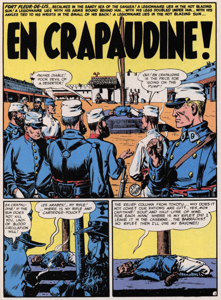 The next story was illustrated by John Severin, whose sister Marie did the coloring for the issue and most of EC’s output. It was scripted and dialogued by Jerry De Fuccio. It’s about a deserter in the French Foreign Legion who is recaptured and punished by being hogtied in the blazing sun, a process known as En Crapaudine. As the deserter slowly dies, he recounts to himself the events of the preceding days, when half in a madness he stalked out from the camp and out into the desert in the middle of the night to face the leader of the Arab forces that were assaulting them. And of course, once the man has died, the other soldiers discover evidence on his person that he did just as he had claimed, and killed the Arab leader. A shame they didn’t think to search him before they staked him out for punishment.