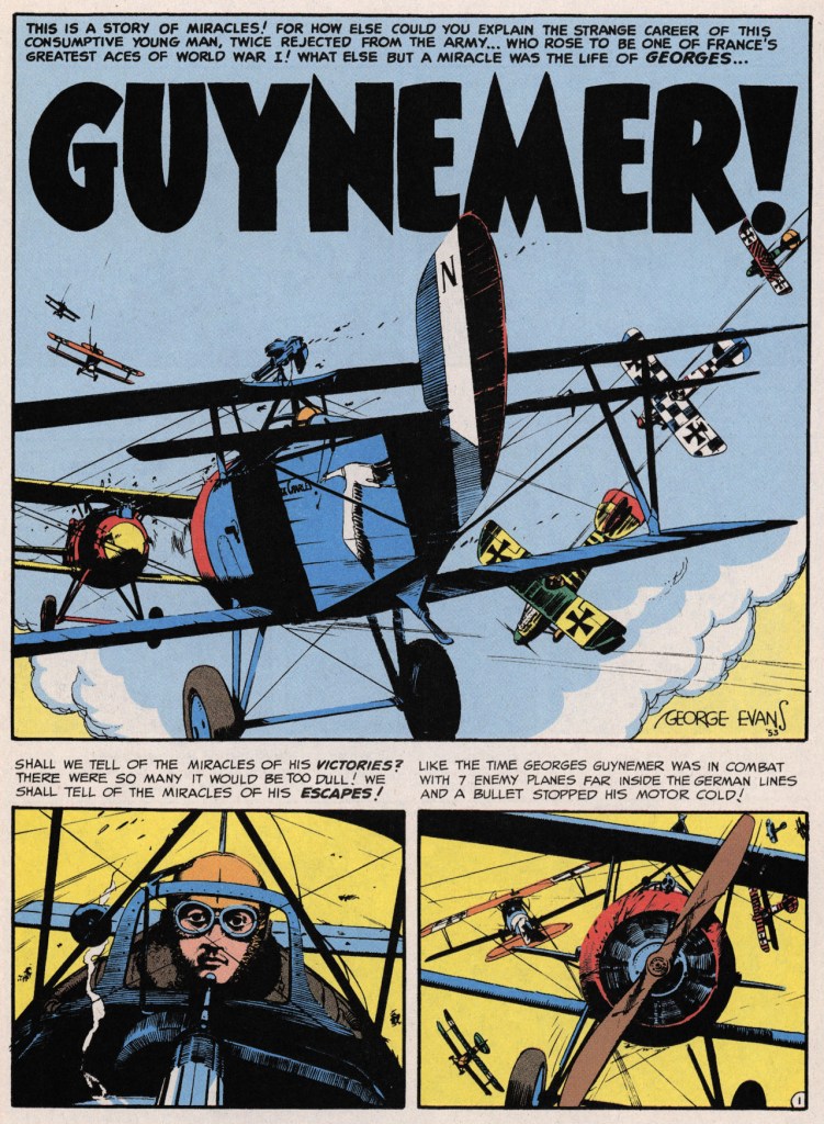 The final story in this issue is the only one written by Harvey Kurtzman, and it’s illustrated by George Evans, who had an abiding love of airplanes. It’s a historical piece that tells the tale of the French aviator Georges Guynemer, including his near-misses with death, the manner in which he regained his nerve after being shot by seeking out an enemy plane and allowing it to empty its machine gun at him without returning fire, and ultimately how he disappeared, his final fate unknown. As was Kurtzman’s way, he researched the subject matter extensively and most of the details in this story jibe with the reality of Guynemer’s life. The real star here, though, is Evan’s polished artwork.
