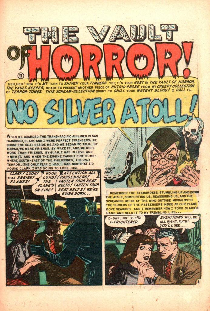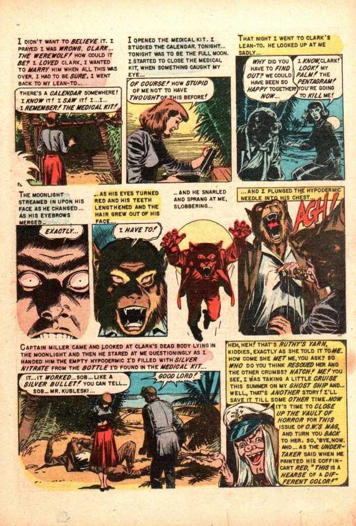 The next story, also by Feldstein and Gaines, has some wonderfully evocative artwork by George Evans, though the story is again only so-so. It’s about the survivors of a plane crash who are marooned on an uncharted island and who are being picked off one by one by what turns out to be a werewolf among their own party. This becomes apparent as all of the passengers’ possessions that contain silver disappear one by one, swiped by the werewolf so as to circumvent his vulnerability to them. In the end, our lead character works out who the werewolf is–it’s the guy she’s been striking up a burgeoning relationship with–and when he attempts to kill her to safeguard his identity, she kills him with a hypodermic filled with silver nitrate, the only silver among the campsite that he had overlooked.