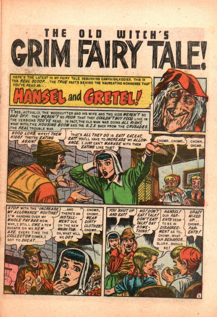 Story number three is another one of those reimaginings of a classic fairy tale that EC liked to do quite often–so often, in fact, that this is the second story based upon Hansel & Gretel within the eight EC comics that I had bought. It’s by Feldstein, Gaines and artist Jack Kamen, who does his usual underrated job on it. The bit here is that the real Hansel & Gretel are both asshole children, little monsters whose parents try to get rid of them before they’re eaten out of house and home, and who murder the little old lady who gives them shelter when they discover she’s got a chest full of coins and jewels that they want. In the end, they reconcile with their parents, the sudden wealth making all of the kids’ past misdeeds water under the bridge. I found this story pretty tedious as a kid and I don’t really think much more of it looking back on it today. Not one of EC’s best.