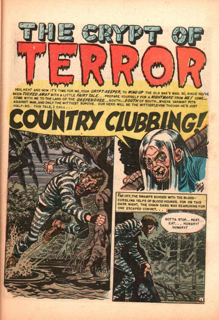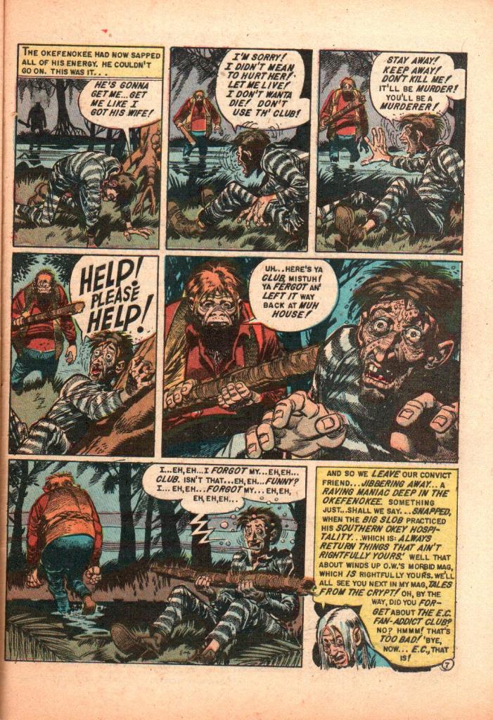 The one memorable story in this issue slotted in way at the back, and it was both written and illustrated by the terrific Jack Davis. It’s all ultimately a long shaggy dog story to get to a punch line, but the punch line is pretty good and unexpected in an EC book, so the whole thing works. It’s about an escaped convict who is looking to elude pursuit and so heads into the swamplands of the area. He comes across a small cottage, and driven by hunger, he murders the old woman he finds there so that he can chow down on the stew she’s making. But the convict didn’t think about who she might be making that stew for, and so he’s surprised when the woman’s in-bred-seeming husband arrives.