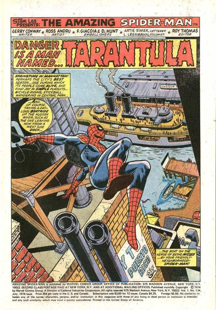 A moment here to talk about Ross Andru, the artist whose work came to define the look of the wall-crawler throughout most of the decade. Ross was a little bit of an acquired taste, not always the prettiest artist, but he got and kept his job on AMAZING thanks to a recommendation from John Romita, who’d been a big fan of his work, and due to the fact that he could always tell an exciting story. Ross was also the first artist to truly make New York City a character in Spider-Man’s world. Prior to this, Romita and others would tend to depict a relatively generic Manhattan. But Ross did the work, venturing into the city and taking reference photos of the places the story would be taking Spidey to. this splash page is a good example of that. Ross shot a photograph of the Hudson River docks from a nearby building, then used it as reference, placing Spidey into the image. I don’t know that most readers cared all that much, but it’s still something to appreciate.
