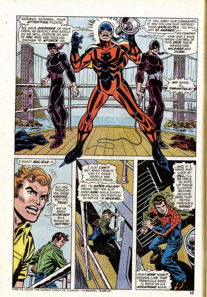 So after a bunch of mad scrambling, Spidey winds up making his way back to the captive ship thanks to a lift from a helpful helicopter, and he’s able to get into it with the Tarantula and his men just moments before Flash Thompson, who put up a show of resistance, can get himself perforated. But the nimble Tarantula is able to score a hit on his web-attired enemy with his drugged shoe-talons, causing Spidey to start to trip out and lose his faculties. And that leads into the big cliffhanger of the isue.