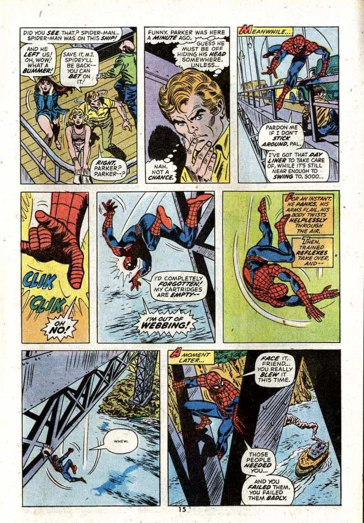 Gerry’s Spider-Man was also often something of a klutz, as on this page where, having saved a man thrown overboard by the Tarantula, he attempts to get back to the boat, forgetting that his web-shooters have discharged all of their contents. This was an extension of Lee’s version of Spidey as a hard luck hero, but somehow Conway dialed it all up to eleven. His Spidey wasn’t incompetent, but he was so tightly-wound that he’d occasionally do something exceedingly foolish or stupid.