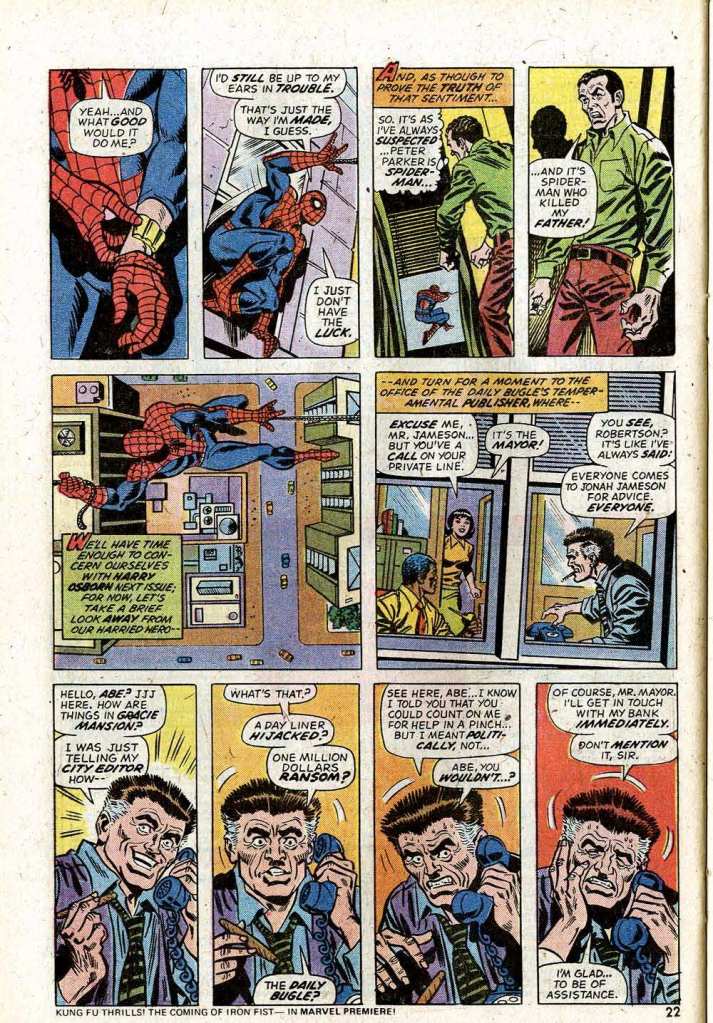 Conway and Andru also continued to use Daily Bugle publisher J. Jonah Jameson as a comedic foil for Spidey, as on this page here. And in fact, this page is a good example of the kind of thing that AMAZING SPIDER-MAN had to offer. In addition to the central action of the issue, in which the cruise that Peter Parker and his friends are taking around Manhattan Island is hijacked by the Tarantula and his goons, we also get on-the-fly subplot shenanigans, such as Peter’s roommate Harry Osborn confirming once and for all that Peter is really Spider-Man when Pete returns to their apartment to score some more web-fluid. And then we drive-by Jonah for a fun bit of comedy, as New York mayor Abe Beame calls Jonah up hoping to convince him to put up the ransom money that the Tarantula is demanding. Jonah would rather die than part with a nickel, but Beame has him right where he needs him to be, on the spot. Ross’s Jameson, inked here with a harsh line by Frank Giacoia, looks a bit more like a gargoyle than a human being. On a separate note, they didn’t do it for all that long, but I have fond memories of those little ad lines plugging other Marvel books that ran at the bottom of the pages in this period. They were crass, but also memorable, and for somebody like me who was coming to this book as a back issue, invaluable for becoming intrigued by what else was on sale at the time.