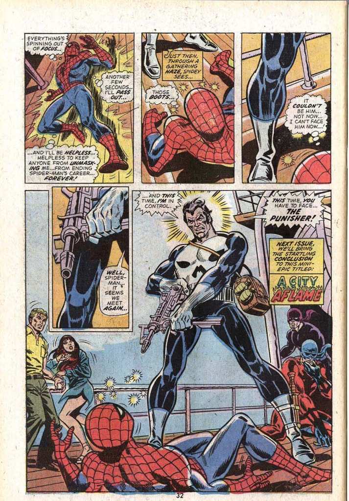 In his delirium, Spidey looks up and sees, in only his second appearance, the Punisher pointing a somewhat teched-out looking firearm at him. This was before anything had yet been revealed about the Punisher’s origin, his real dame wasn’t even known yet. He’d just had one misguided battle with Spider-Man at the prompting of the Jackal, and called it off when he realized that Spidey wasn’t the murderer he thought he was. But his appearance here is framed as bad news for the wall-crawler, and definitely makes it feel like the stakes in the story have been suddenly raised. How this would all work out I’d have to wait literally years to find out, as Don didn’t own the second part to this story and I wouldn’t read it until it was reprinted years later in MARVEL TALES.