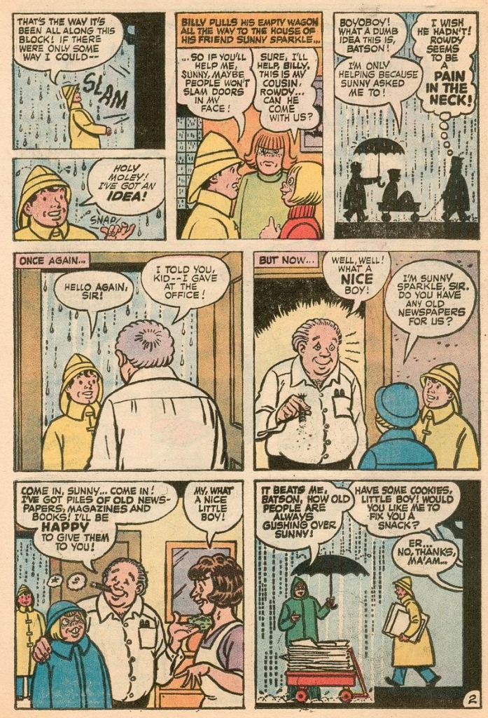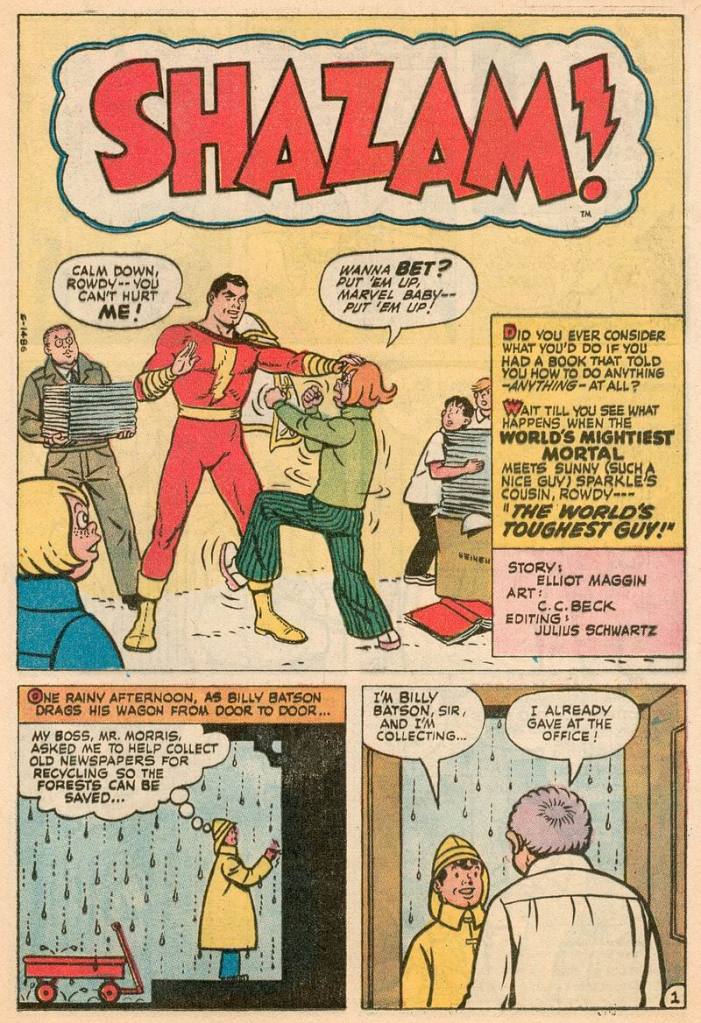 The second story is a follow-up to an earlier tale that had introduced the character of Sunny Sparkle, a kid whose demeanor is so nice that everybody gives him anything that he asks for. This sequel introduces Sunny’s cousin Rowdy, who’s a bad egg. It opens with Billy Batson on a paper drive, collecting for recycling. He convinces Sunny to help him, as nobody can refuse Sunny anything. Sunny, though, brings along his cousin Rowdy. The trio winds up collecting a rare spell book among other things, and when they’re caught in a downpour, Billy is able to use the magic in the book to stop the rain. Rowdy, seeing that the magic is real, uses the book to make himself the toughest person on Earth.