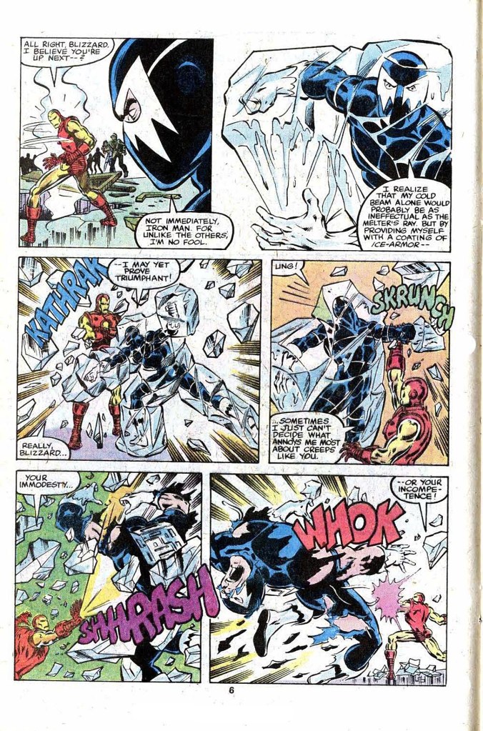The creative team also did something else that was instrumental in making IRON MAN a better read: they treated their lead character as a genuine powerhouse, one who would routinely mop the floors with enemies who once had given him a genuine challenge. The opening to this issue is a good example of this. While the prior issue had concluded with Iron Man on the ropes in terms of setting up an appropriate cliffhanger, this issue’s opening pages are dedicated to Iron Man beating the holy hell out of Blizzard, the Melter and Whiplash, three villains who had vexed him in the past. The action here feels cathartic, as Iron Man is given a personality that makes it clear that, while this isn’t all an absolute cake walk, he’s got the upper hand throughout.