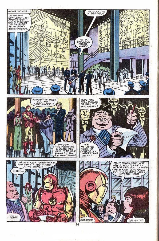 As the story begins to move towards its climax, Iron Man has an appointment to meet with the visiting Ambassador of the nation of Carnelia at the United nations on behalf of Stark International. Bethany is there also, working as the Ambassador’s security. It’s a bit of a P. R. play, one that Iron man isn’t entirely comfortable with. But needs must. Unfortunately, it’s at this point that the mysterious figure who has been behind the recent malfunctioning of Iron Man’s armor chooses to strike. This is Justin Hammer, about whom we know very little at the moment apart from the fact that he’s a shady competitor of Stark’s. Hammer’s tech team has been able to override the systems in Iron Man’s armor remotely a couple of times so far, and he’s after the same contract that Stark International will be getting from Carnelia. So it’s time to throw a wrench in those plans.