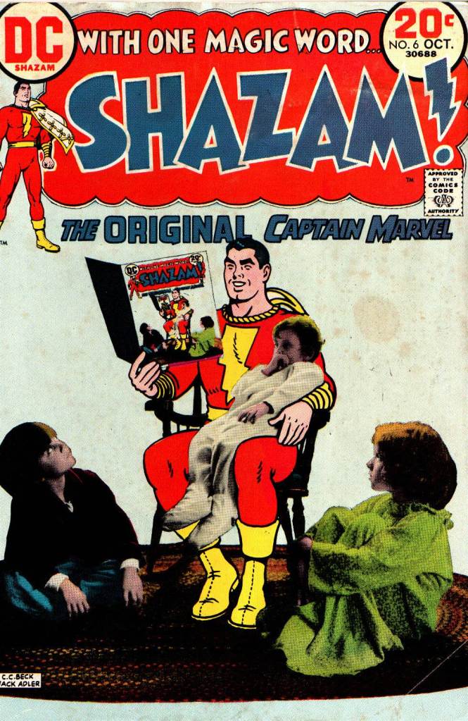 I was still making my way through the complete run of SHAZAM that I had borrowed from my grade school friend Donald Sims. SHAZAM #6 featured the series’ second photo cover, and it was a bit less successful and convincing than the prior one which had run on issue #2. But there was something appealing about the fact that it was set up as an “infinity cover”, with the cover appearing within the image as the cover of the comic book that Captain Marvel is reading. The kids in this image are the grandchildren of DC production man Jack Adler, whose skills are what made doing a photo-cover of this sort possible in the first place. DC continued to experiment with this approach here and there from time to time.