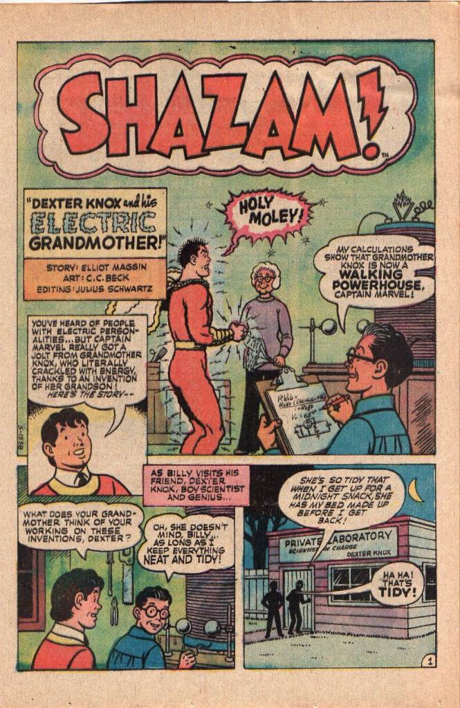 The second story was written by Schwartz’s recent find, Elliot S! Maggin. It’s about how genius inventor Dexter Knox’s grandmother accidentally gets zapped with a massive jolt of electricity while she’s tidying up Dexter’s lab. This turns her into a living dynamo that causes anything she touches, such as her vacuum cleaner, to run wild. Even Captain Marvel can’t stop the supercharged vacuum cleaner until its used up all of its charge. So this is a bit of a problem.